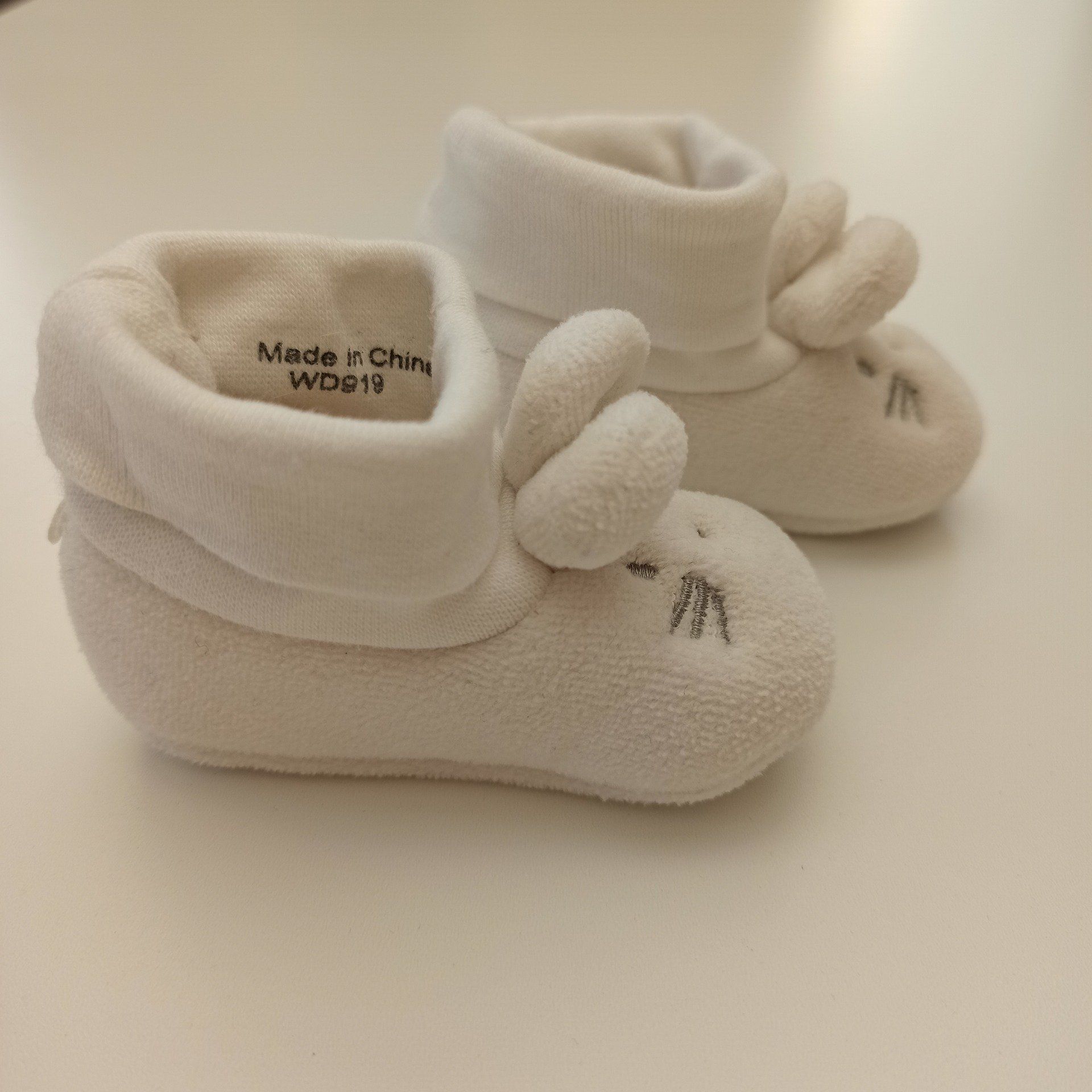 Chaussons naissance avec petits lapins sur le dessus.