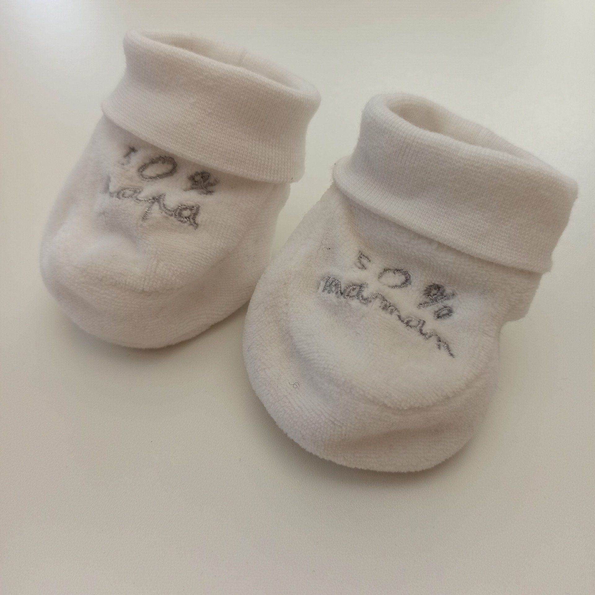 Chaussons naissance en velours, 50% maman, 50% papa.