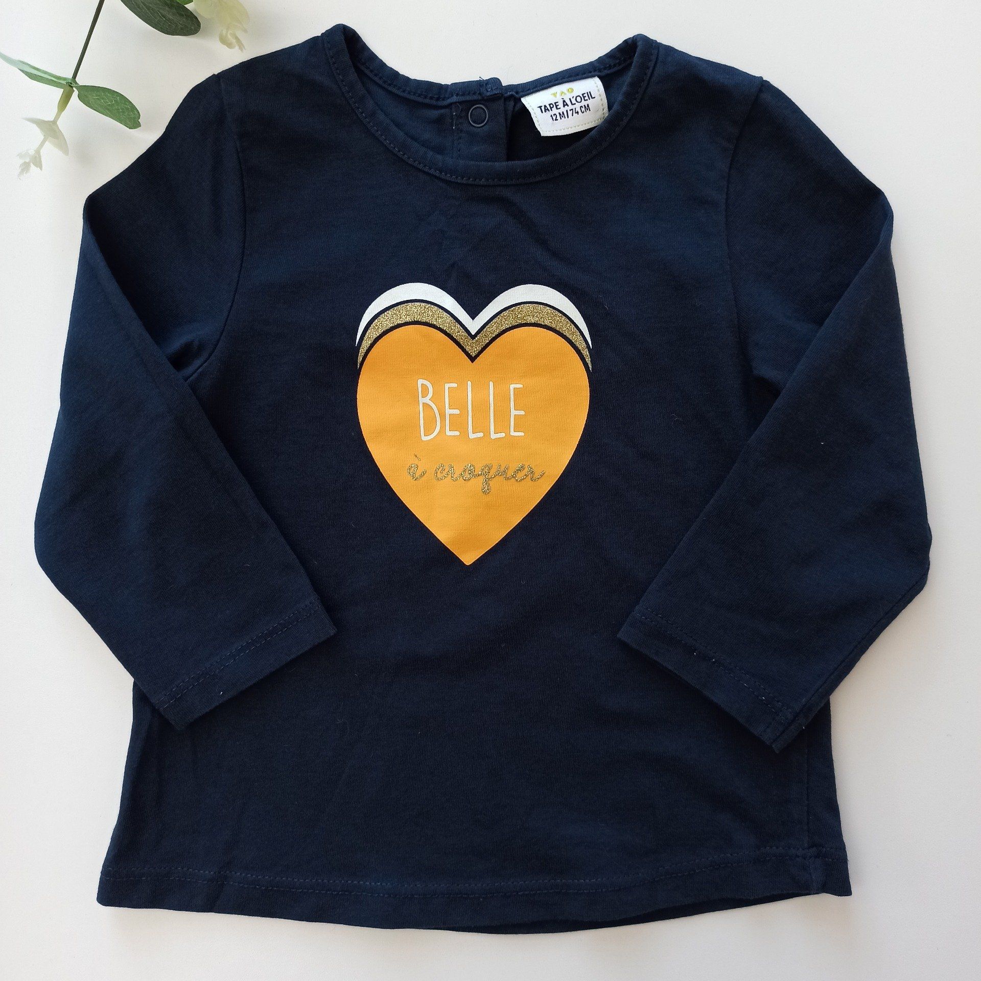 Tee-shirt manches longues 12 mois, avec motif coeur.